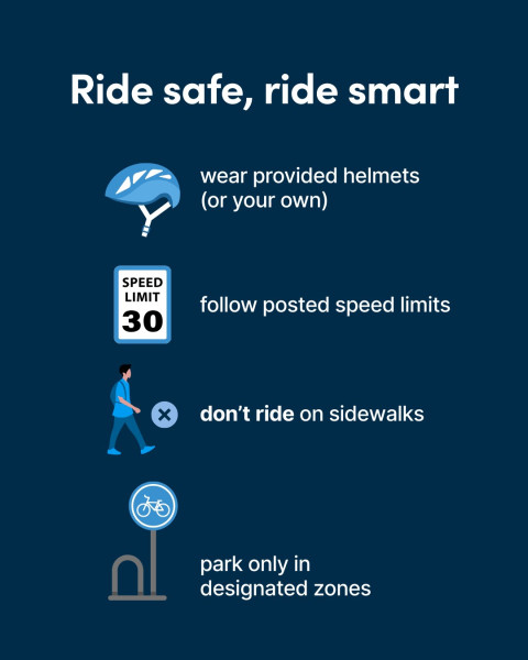 - park your e-scooter or e-bike standing up in the designated parking zones. Don’t block sidewalks, roads, doorways, driveways, bike lanes or other important spaces