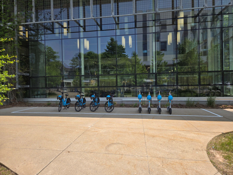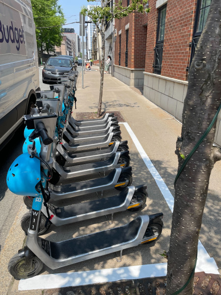- park outside the painted/taped lines or marked parking spots for e-bikes and e-scooters;